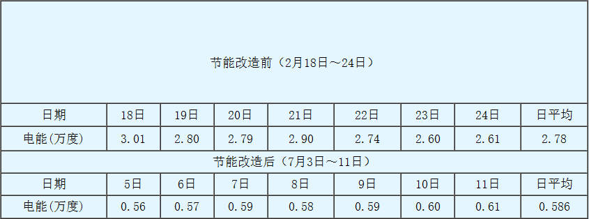 华电某电厂2#炉实施节能升级改造,从下表两个不同时间段中可看出常规供电运行时 日平均耗电2.78万度,节能优控运行时日平均耗电0.586万度,节电率为78.92%;若按机组一年运行280天和每度电0.4元计算,一年可节电 725.2万度,节省290.8万元,节能效率十分可观。