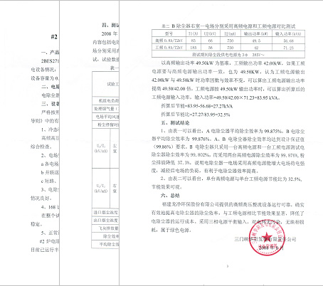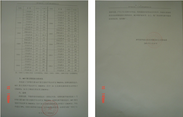 高频电源、节能控制系统投运后一直稳定可靠,高频电源节能改造前1号炉除尘器6kV除尘变的平均功率为780kW/h,高频电源节能改造后,6kV除尘变的平均功率为340kW/h(其中24台高频电源的耗电功率低于120kW/h),节电率超过50%,且除尘效率略有提高,出口排放25mg/Nm3,测试数据由华北电科院,提供完全满足排放要求。