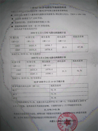 内蒙古上都电厂2#炉(600MW)机组电除尘器节能改造,本体部分为我公司BEL型:电场阴极线均为针刺线,阳极板为ZT24板,一二三电场同极距为405mm,四五电场同极距为450mm。振打方式为阴极顶部电磁锤振打,阳极侧部电机振打。双列双室,每室各有五个电场,其中一~三电场采用左右分区供电。2009年4月,该电厂对2#炉电除尘器实施高频电源节能提效改造,取得了良好的效果,改造调试完成后,由华北电力科学研究院对电除尘进行测试。测试结果表明,机组待580MW负荷运行时,2#机组电除尘在投运三个电场的运行状态下,除尘器出口烟尘排放浓度平均值为53mg/Nm3,在投运4个电场的运行状态下,除尘器出口烟尘排放浓度平均值为23 mg/Nm3。从4月下旬开始投运以来,电除尘器日耗电量由4.93万度下降至2.13万度,节电率达到了56%以上,真正达到了提效节能。